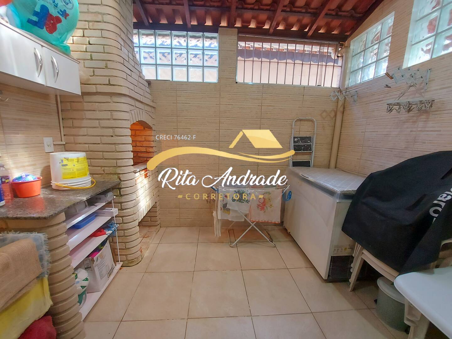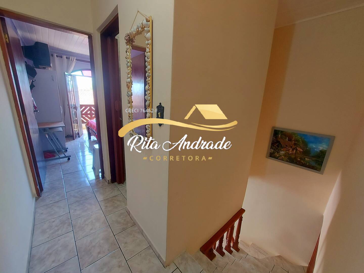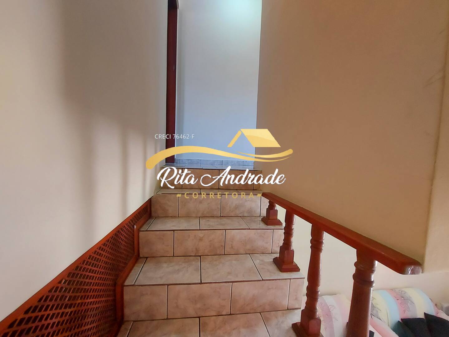 Internamente na frente área ampla privativa com jardim e varanda - sala 2 ambientes - armário embaixo da escada - cozinha estilo americana - balcão - armários - nos fundos área de lazer coberta e revestida com churrasqueira - lavabo - lavanderia coberta